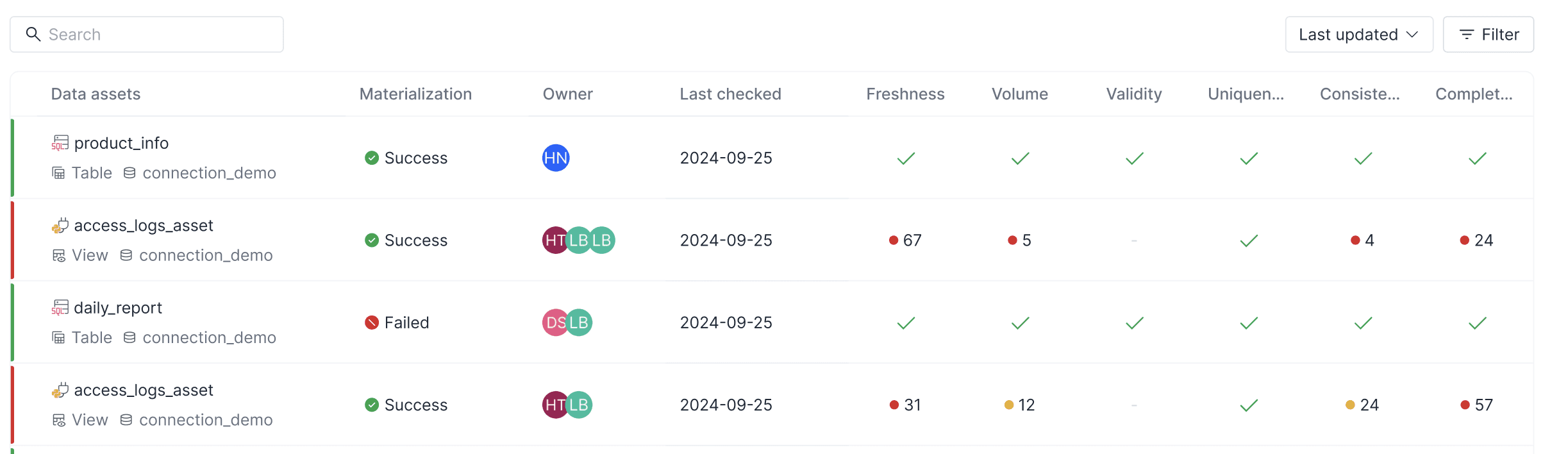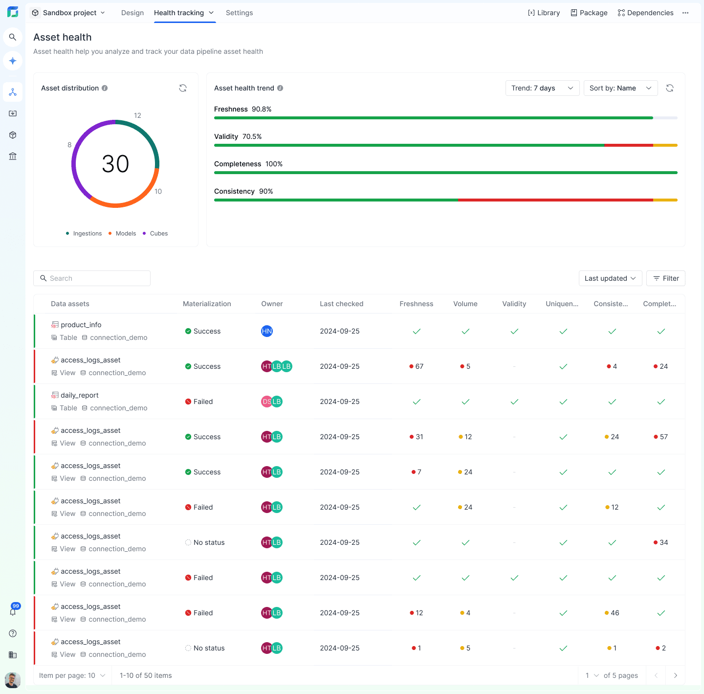 Detailed Health Metrics: Each data asset displays key health indicators: